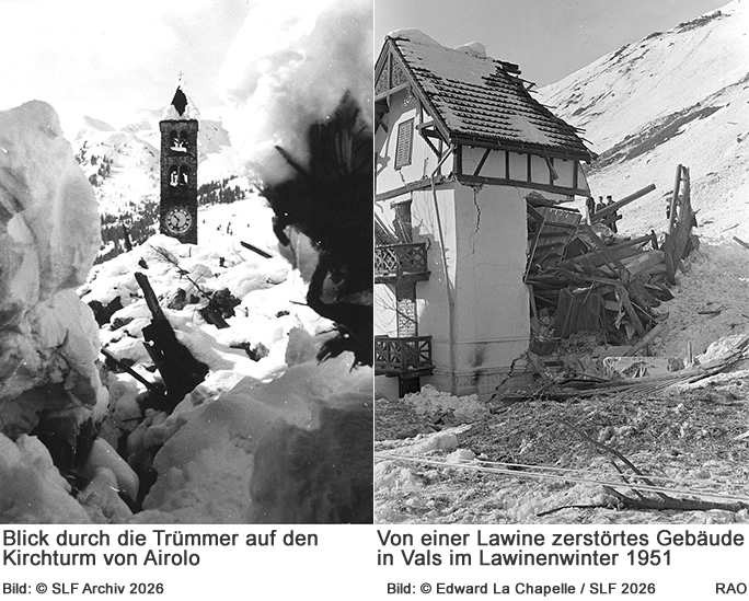 Lawinenwinter 1951: So kam es zur Katastrophe Die Analyse: Serie über die Folgen des Lawinenwinters 1951, vom Schutzwald über Lawinen verbauungen bis hin zu Gefahrenkarten. ● Lawinenwinter 1950/51: 98 Tote, 1500 zerstörte Gebäude allein in der Schweiz, besonders betroffen: Vals, Andermatt, Airolo. ● Extremer Schneefall: Zwei Hochphasen nach rekordhohen Niederschlägen im Januar und Februar. ● Reaktion des SLF: verbesserte Lawinenwarnung, intensivierte Forschung, erste Verbauungsrichtlinien und Grundlagen für Gefahrenkarten.