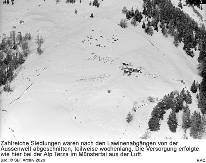 88 Stunden Dauerschneefall Einer der ersten, die analysierten, wie es dazu kam, war SLF-Meteorologe Theodor Zingg. Er verglich die Niederschlagsmengen von November 1950 bis Februar 1951 mit langjährigen Durchschnitten. Auf einen sehr ergiebigen November folgte ein unterdurchschnittlicher Dezember. Dann ging es richtig los. «Die Niederschläge überschreiten in den Katastrophengebieten in den Monaten Januar und Februar dreihundert Prozent der Normalmenge», schrieb Zingg. Weitere Untersuchungen bestätigen das Ergebnis. Allein im Januar 1951 fielen südöstlich der Linie Zermatt - Simplon - Furka - Erstfeld - Glarus - Sargans mehr als 200 Prozent der üblichen Januar-Niederschläge. lm Tessin, in Mittelbünden, im Engadin und in den Bündner Südtälern waren es sogar verbreitet dreihundert bis vierhundert Prozent. Teilweise lag die Schneefallgrenze noch bei 1'500 m ü.M. Aber in der Nacht auf den 16. Januar 1951 strömte kalte Luft in die Schweiz. Es schneite bis in die Tallagen. Nach einer kurzen Pause setzten die Niederschläge am 18. Januar 1951 wieder ein - für 88 Stunden am Stück. Das sind dreieinhalb Tage Dauerschneefall. Gleichzeitig erhob sich ein Sturm. «Insgesamt lagen danach nördlich des Alpenhauptkamms 100 bis 250 cm Neuschnee. Auch am schneereichen Alpennordhang sind das Neuschneemengen, die selten sind, typischerweise nur etwa alle zehn bis fünfzig Jahre vorkommen», sagt Schweizer. Und der setzte sich talwärts in Bewegung und drang bis in die Siedlungsgebiete vor. Allein in den vier Tagen vom 19. bis 22. Januar 1951 richteten fast 1'000 Lawinen Schäden an. In Vals (GR) zerstörte eine 300 Meter breite Lawine 23 Gebäude zwischen Dorfbrücke und dem Kurhaus Therme. Sie verschüttete 30 Personen, 19 starben. In Andermatt (UR) zerstörte eine Lawine ein Haus und tötete die acht Bewohnerinnen und Bewohner sowie einen Arbeiter auf der Strasse. Einen Mann, der auf dem Dach Schnee schaufelte, schleuderte die Druckwelle sechzig Meter weit auf die andere Talseite, wo er unverletzt landete. Nur wenige Stunden später kamen im Ortsgebiet weitere vier Personen ums Leben. Allein diese drei Abgänge zerstörten oder beschädigten 28 Gebäude im Ort. Auch in anderen Ortschaften in der Schweiz starben Menschen und Vieh, versanken Häuser, Ställe und Infrastruktur in den Schneemassen. Zahlreiche Orte waren von der Aussenwelt abgeschnitten. Flugzeuge warfen Medikamente, Lebensmittel, Holz und Treibstoff ab. 30'000 Kilogramm Gebrauchsgüter brachten sie so in 167 Flugstunden zu den Bedürftigen.