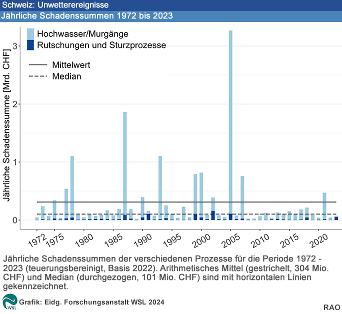 Die Eidgenössische Forschungsanstalt WSL sammelt seit 1972 systematisch Informationen über Unwetterschäden. Die mit Unterstützung des Bundesamts für Umwelt BAFU erstellte Datenbank enthält Angaben zu Schäden durch Hochwasser, Murgänge und Rutschungen sowie zu Steinschlag, Fels- und Bergsturz. Schäden als Folge von Lawinen, Schneedruck, Erdbeben, Blitzschlag, Hagel und Sturmwind werden in den Auswertungen nicht berücksichtigt. Die Abschätzung der Sach-, Infrastruktur-, Wald- und Landwirtschaftsschäden basiert hauptsächlich auf Medienberichten. Die Daten stehen Fachleuten auf Anfrage zur Verfügung und bilden eine wichtige Grundlage zur Gefahrenbeurteilung. Die Erhebung zu den Unwetterschäden durch die WSL dient der Umweltberichterstattung des Bundesamts für Umwelt BAFU.