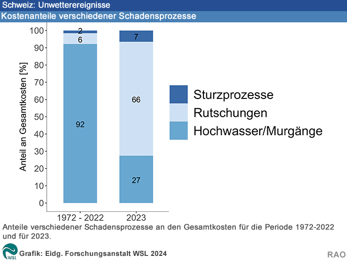 Lokal kam es im Jahr 2023 zu grossen Schäden, schweizweit betrachtet war 2023 im Vergleich zum langjährigen Mittel und Median jedoch ein eher schadenarmes Jahr. Nicht zuletzt dank guter Präventionsmassnahmen gab es 2023 erfreulicherweise keine Todesopfer durch Hochwasser, Murgänge, Rutschungen und Sturzprozesse. In der 52-jährigen Beobachtungsreihe rangiert das Jahr 2023 mit einer Schadenssumme von 75 Millionen Franken auf Platz 37. Der grösste Teil der geschätzten Schadenskosten (rund 66 %) entstand durch Rutschungen, gefolgt von Hochwasser (21 %), Steinschlag und Felssturz (7 %) und Murgängen (6 %). Ursache waren vor allem Dauerregen (67 %) und Regen in Kombination mit Schneeschmelze (18 %).