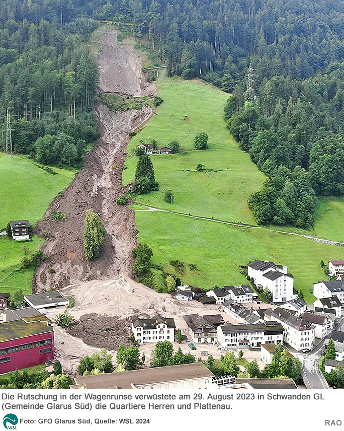 Das Schadenjahr 2023 wurde dominiert von den Ereignissen in Schwanden (Gemeinde Glarus Süd). Dort ging am 29. August 2023 eine grosse Rutschung ins Siedlungsgebiet nieder, zerstörte mehrere Häuser und machte weitere unbewohnbar.