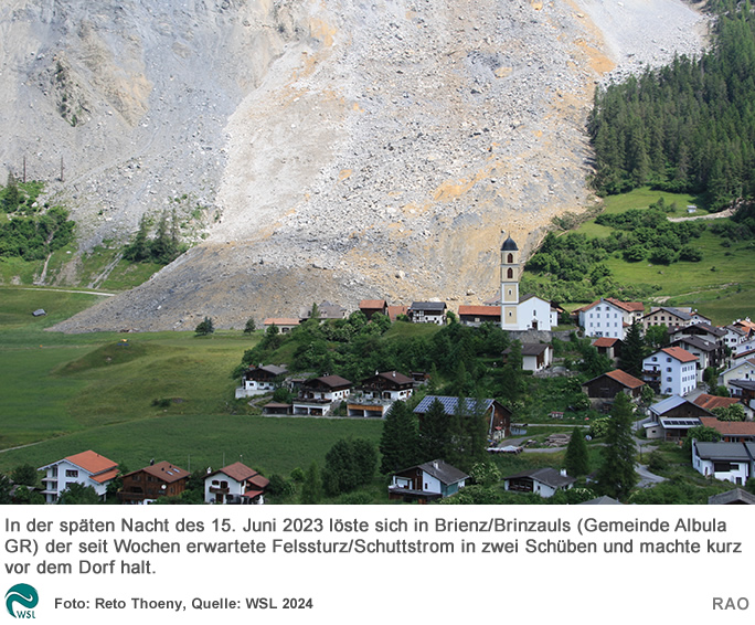 Eine aussergewöhnliche Situation erlebte auch das Dorf Brienz/Brinzauls in der Gemeinde Albula GR, wo nach wochenlanger Evakuation der Dorfbevölkerung am 15. Juni 2023 der erwartete Felssturz/Schuttstrom niederging, ohne im Dorf selbst Schäden anzurichten.