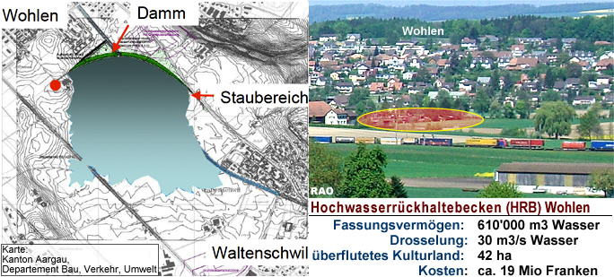 Das Hochwasserrückhaltebecken (HRB) bei Wohlen und im Nidermoos bei Bünzen fassen 610'000 m3 und 950'000 m3 Wasser. Aus dem HRB Wohlen können die Drosselungsbauwerke 30 m3/s und aus dem HRW Nidermoos 12 m3/s ablassen. Beide Projekte kosten je etwa 19 Millionen Franken. Beim HRB Wohlen werden 42 ha Kulturland überflutet, beim HRB Nidermoos rund 120 ha. Bei den Hochwassern in den Jahren 1994, 1999 und 2007 betrug die Schadenssumme in der Region Wohlen rund 6 Millionen Franken. Die betroffene Bauern erhalten künftig Entschädigungszahlungen.