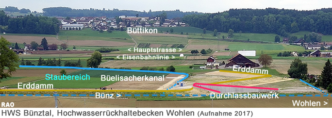 Das Hochwasserrückhaltebecken Wohlen besteht aus einem 850 Meter langen Erddamm, der das Hochwasser zurückhält. Der Damm wird gut ins Landschaftsbild des Bünztals eingefügt und die Dammböschungen werden begrünt. Das Durchlassbauwerk am unteren Ende des Dammes reduziert den Wasserabfluss für die Unterlieger-Gemeinden um rund einen Drittel automatisch auf maximal 30,5 Kubikmeter pro Sekunde. Der vorhandene Baugrund bedingt, dass das Durchlassbauwerk auf Pfählen fundiert wird. |