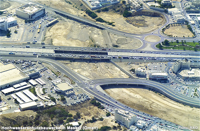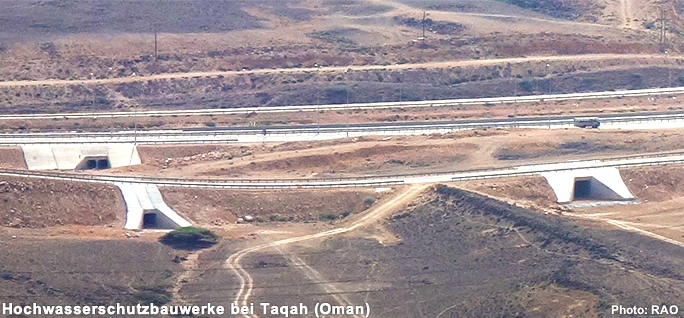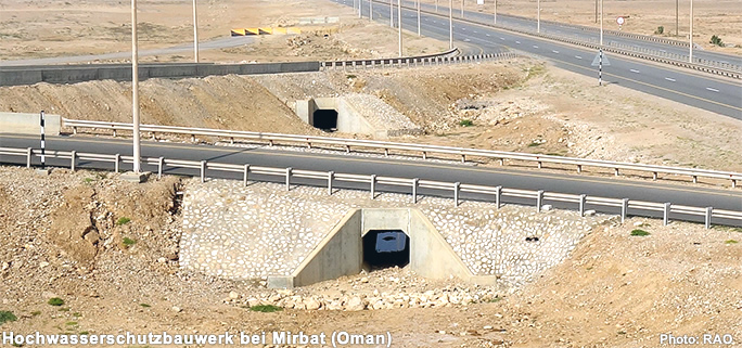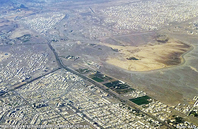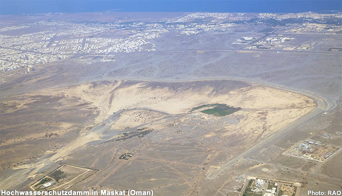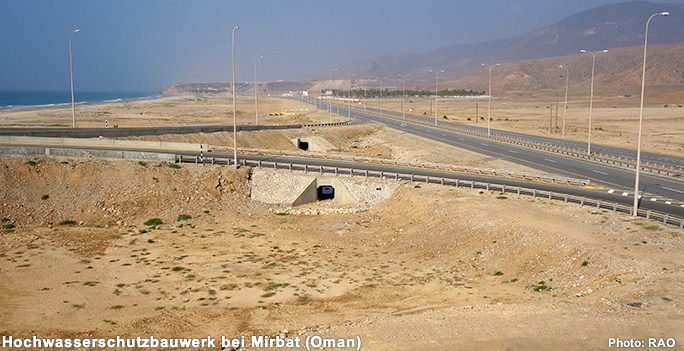 Der Hochwasserschutz nimmt bei der Gestaltung der Überbauungspläne der Siedlungszonen in Oman einen grossen Stellenwert ein. Oman hat kaum ganzjährig fliessende Gewässer. Ausnahmen bilden die aus den Quellgebieten entlang von Gebirgen abgliessenden Gewässer wie die Quellen im und am Jebel al Qara in Dhofar, welche entlang der Küste Süsswasserzonen (Khor - Bsp. Khor Mughsayl oder Khor Rori (Rawri)am Ende des Wadi Darbats) bilden. Nach stärkeren Regenfällen, welche Gewitter oder den Durchgang von tropischen Zyklonen begleiten, fliessen grosse Wassermassen von den Abhängen der Gebirge wie dem Dhofargebirge her durch die Küstenebene und strömen dem Meer zu.