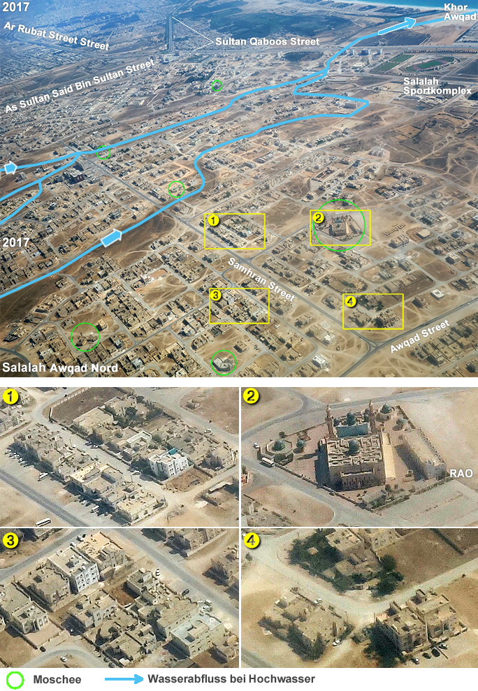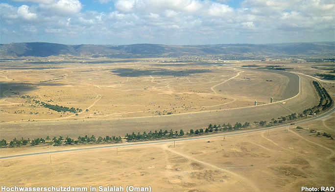Nach starken Regenfällen strömen aus dem Dhofargebirge riesige mit Sedimenten durchtränkte Wassermengen in die Ebene, in welcher die Stadt Salalah liegt. Die Behörden haben einen mächtigen Hochwasserschutzwall gegen die Wasserfluten um die Hauptsiedlungsgebiete der Stadt bauen lassen. In ganz Oman verteilt gibt es viele Bauwerke, welche dem Hochwasserschutz dienen.