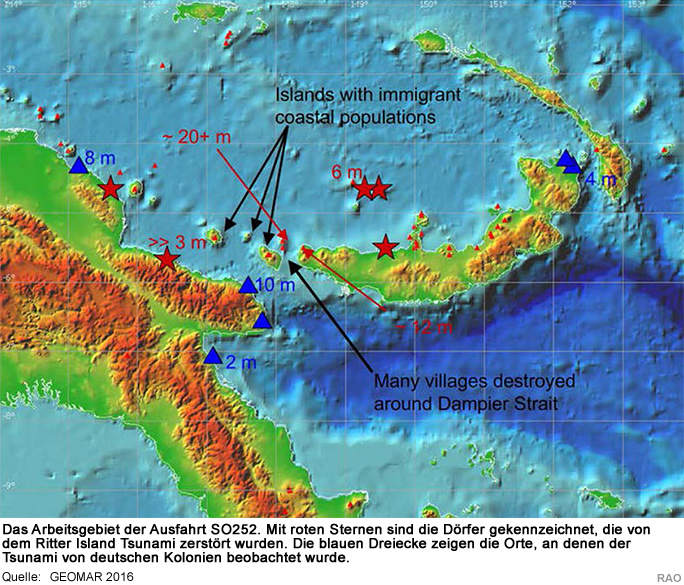 Im Rahmen einer mehrwöchigen Expedition wollen Kieler Meeresforscher unter der Leitung des GEOMAR Helmholtz-Zentrums für Ozeanforschung Kiel mit dem deutschen Forschungsschiff SONNE das Auseinanderbrechen der Ritter Insel in der ehemaligen deutschen Kolonie Neupommern im Westpazifik vor Papua-Neuguinea untersuchen.