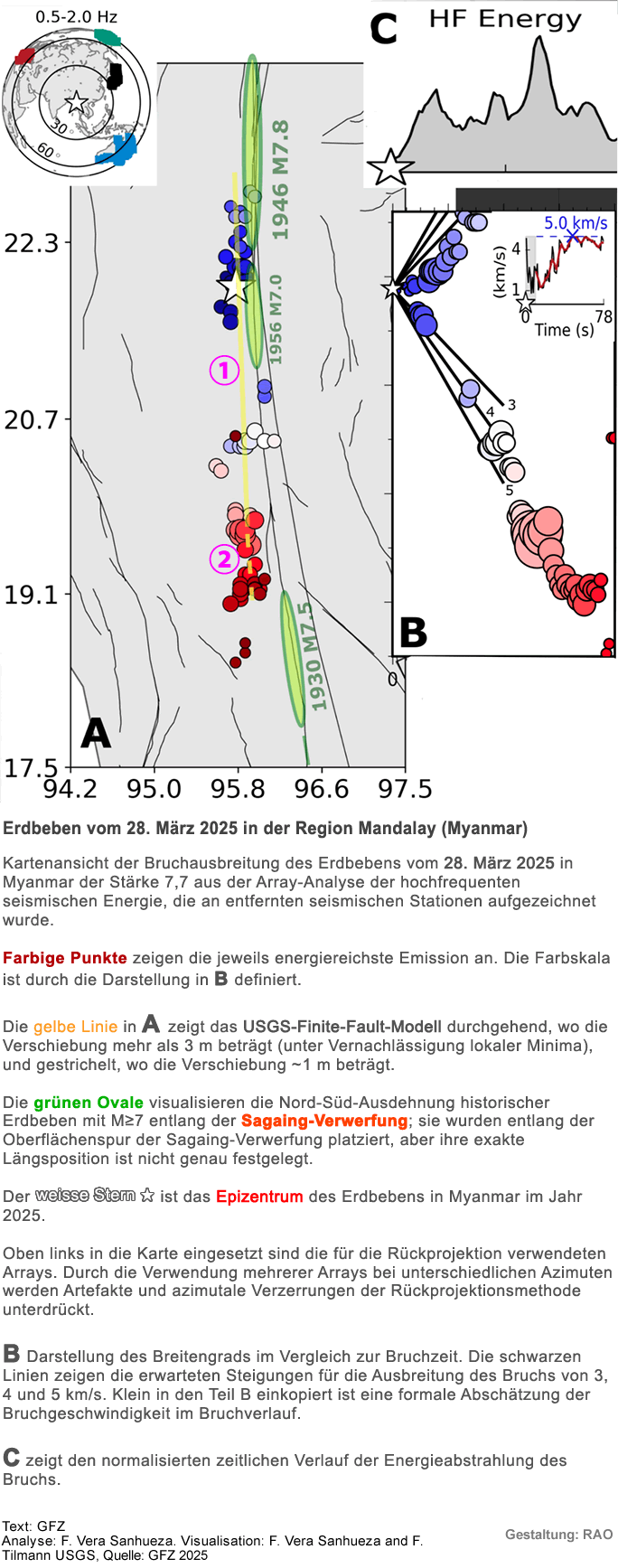 Während das Erdbebengebiet von 2025 zuvor als seismische Lücke identifiziert wurde (z. B. Hurukawa & Maung Maung, 2011), hielt der tatsächliche Bruch einige Überraschungen bereit, z. B. eine viel längere Bruchlänge als erwartet und die unerwartete Variation des Versatzes innerhalb der seismischen Lücke.
