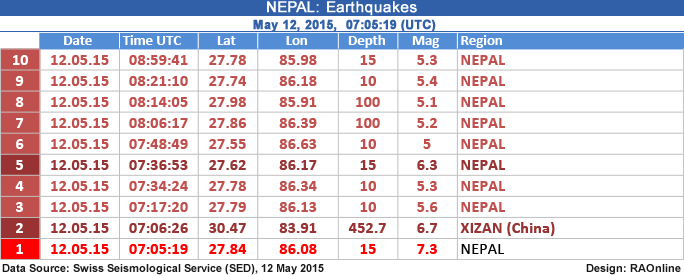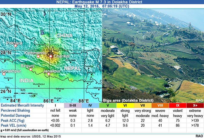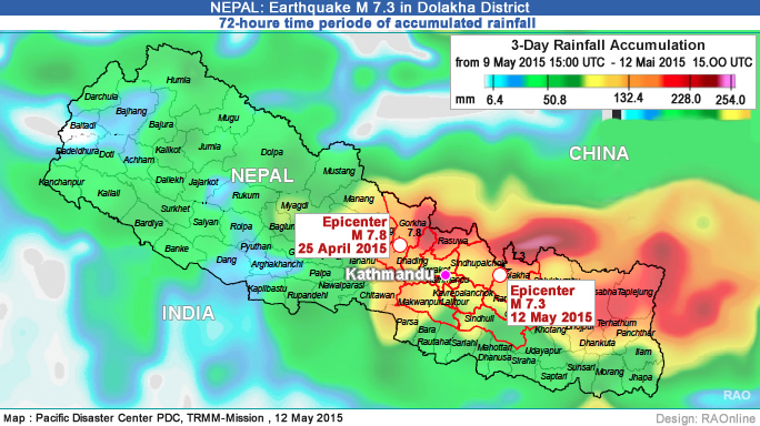 | Ein weiteres starkes Erdbeben mit einer Magnitude von 7.3 (Moment magnitude scale (Mw)) hat am 12. Mai 2015 um 7:05 UTC (9:05 Mitteleuropäische Zeit MEZ oder 12:50 Lokalzeit) den Dolakha Distrikt heimgesucht.