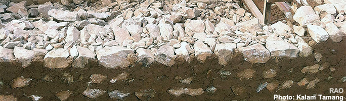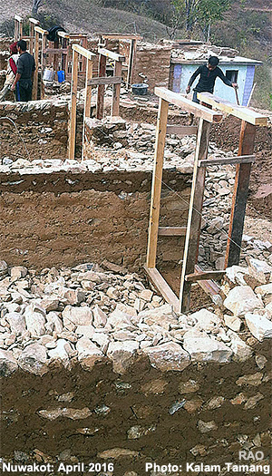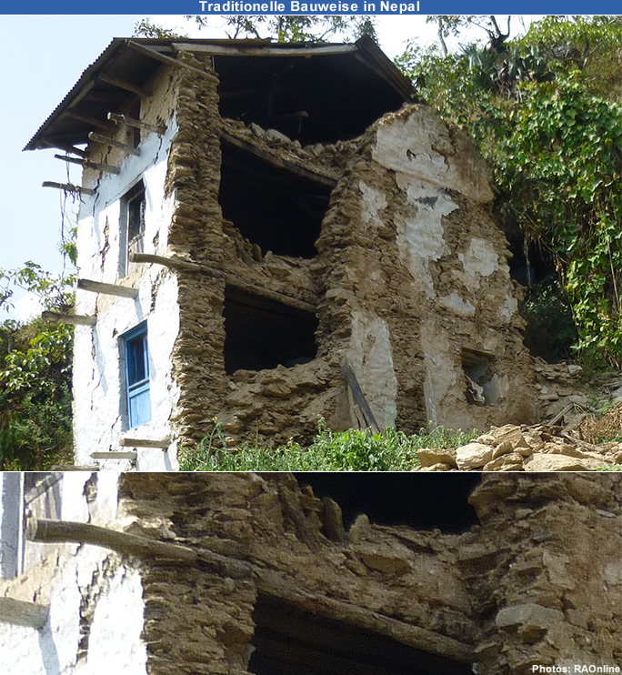 | Nach Angaben der Rettungskräfte wurden in den vom Erdbeben stark betroffenen Gebiete die meisten mit Natursteinen aufgebauten Häuser beschädigt oder zerstört. Die Steine wurden jeweils mit Erdmaterial verbunden. Diese Bauart von Häusern ist typisch für die Berggebiete in Nepal.