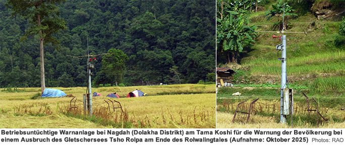 In einer Flussebene bei Nagdah steht mitten in den Reisfeldern eine Anlage, welche die Bevölkerung bei einem Ausbruch des Tsho Rolpa-Gletschersees im Rolwalingtal warnen soll. Die Warnanlage kann ihre Aufgabe, die Menschen vor einer heranrolleden, mehrere Meter hohen Flutwelle zu warnen, nicht mehr erfüllen. Wesentliche für ihre Betriebsbereitschaft notwendigen Teile wurden abmontiert. Die Stromversorgung für die Antenne und das Signalhorn fehlt. Das Solarpanel wie auch der dazugehörende Akku wurden entfernt. Die Anlage bleibt im Notfall stumm.