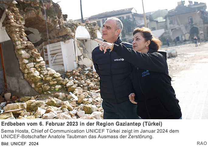 Ende Januar 2024 besuchte der UNICEF-Botschafter Anatole Taubman verschiedene Programme in der Erdbebenregion. Dort konnte er sich einen Überblick über die Arbeit verschaffen, die UNCEF vor Ort leistet und mit den betroffenen Kindern sprechen.