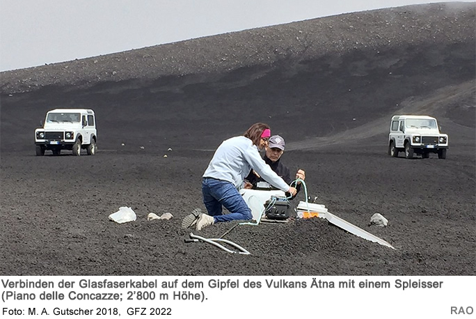 Philippe Jousset vom Deutschen GeoForschungsZentrum Potsdam GFZ und Gilda Currenti vom italienischen Istituto Nazionale di Geofisica e Vulcanologia INGV und ihre Kolleg:innen haben untersucht, inwiefern sich Glasfaserkabel zur Messung sehr schwacher seismischer und vulkanischer Aktivität eignen. Hierfür verlegten sie in einem gemeinsamen Experiment am Vulkan Ätna in rund 2 Kilometer Entfernung von den Gipfelkratern ein 1,3 Kilometer langes Glasfaserkabel, gut 20 Zentimeter tief in einer Schlackenschicht, und massen die Dehnungsänderungen des Kabels, die von den verschiedenen Aktivitäten verursacht wurden.
