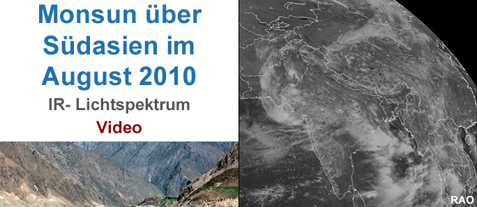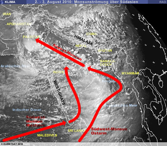 | Die schlimmsten Fluten seit 1929 suchten Pakistan im Juli und im August 2010 heim. Ursache dieser Katastrophe sind heftige Monsuniederschläge über dem nördlichen Indusbecken.Satellitenbilder zeigen, dass sich während Tagen immer wieder Wolken über dem zentralen Himalaja gebildet haben.Als Folgeder Südostmonsunströmung wurden diese Wolkenbänder nach Nordwesten ins nördliche Pakistan getrieben.Die in diese Windströmung eingelagerten Gewitterzellen verstärkten sich. über Nordpakistan entluden sich immer wieder heftige Wolkenbrüche. |