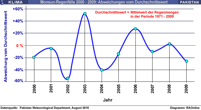 Für das gesamte Pakistan wurden im Juli 2010 rund 72% höhere Regenfälle als in der Vergleichsperiode 1971-2000 gemessen. In der Region NWFP (Northwest-Frontier-Province) überstiegen die Niederschläge den Normalfall um rund + 180%, im Punjab um +57%, in Balochistan +20%und in Sindh + 34%.