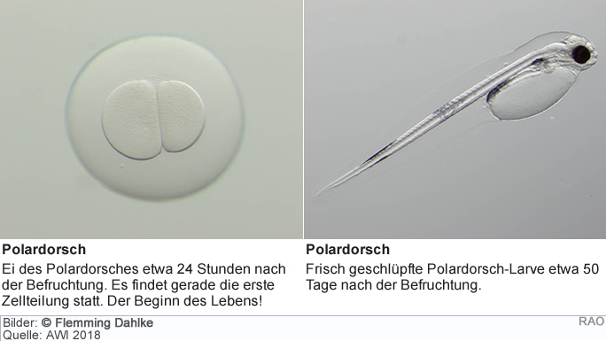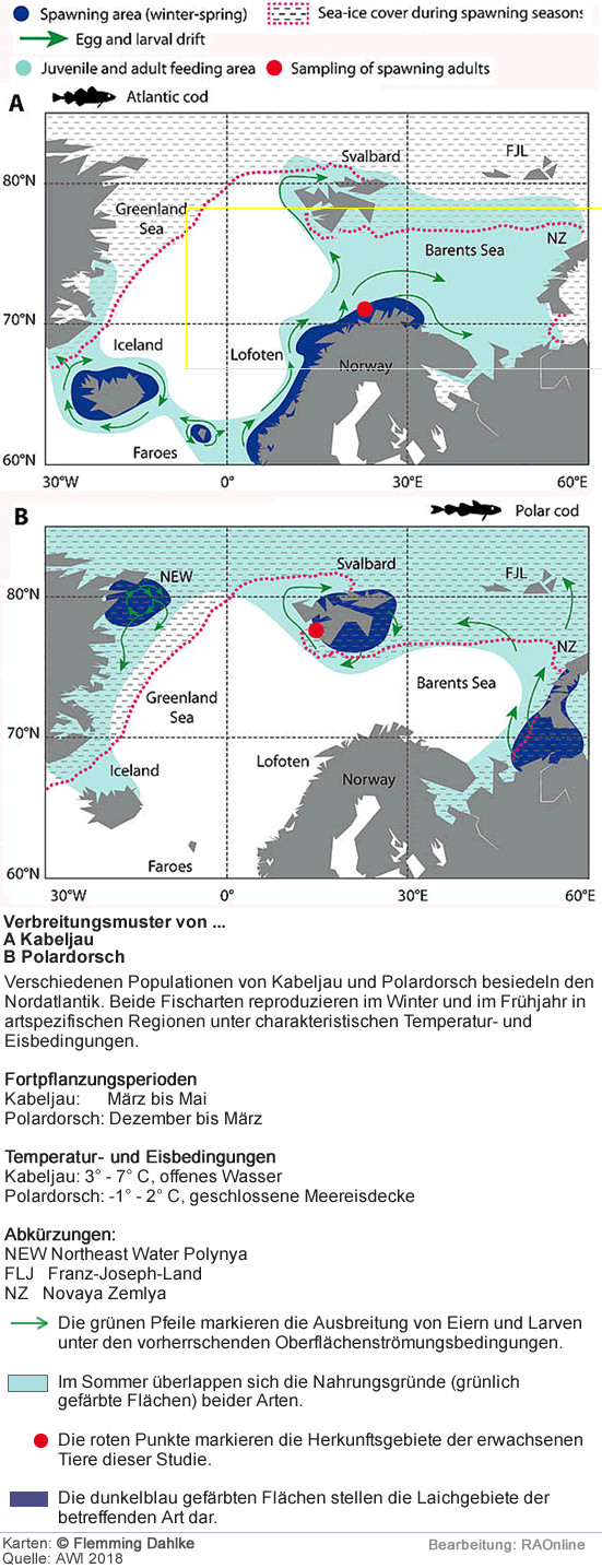 Aktuelle Untersuchungen von AWI-Forschern zeigen, dass sich die Überlebenschancen für den Nachwuchs wichtiger Fischarten im Nordatlantik dramatisch verschlechtern, falls das 1,5°C Ziel des Pariser Klimaabkommens nicht erreicht wird. Bei unverminderter Erwärmung und Versauerung der Meere wären der Kabeljau und sein arktischer Verwandter - der Polardorsch - gezwungen sich neue Lebensräume im Hohen Norden zu suchen. Ihre Bestände könnten schrumpfen. Betroffen wären nicht nur die Kabeljaufischer in Norwegen, Island oder Russland, sondern auch arktische Robben, Seevögel und Wale, für die der Polardorsch eine essentielle Nahrungsquelle darstellt.