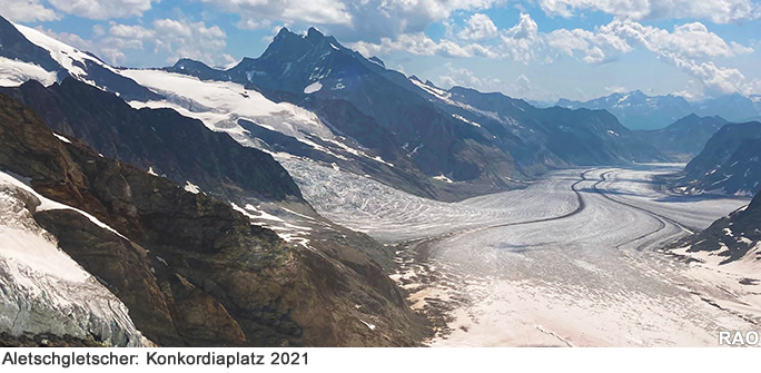 Die Gletscher waren deshalb noch bis in den verregneten Juli 2021 relativ gut durch den Winterschnee geschützt. Dennoch war die Schmelze bis Ende September 2021 beträchtlich und schweizweit gingen während der letzten 12 Monate rund 400 Millionen Tonnen Eis verloren, fast 1% des verbleibenden Gletschervolumens.