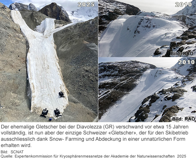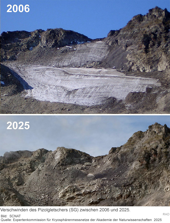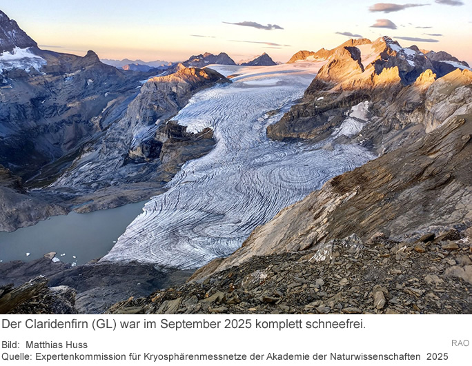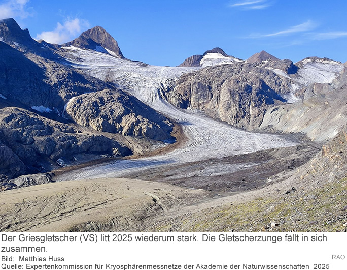 Auch im internationalen UNO-Jahr zur Erhaltung der Gletscher sind diese in der Schweiz weiter massiv geschmolzen. Nach einem schneearmen Winter brachten Hitzewellen im Juni 2025 die Gletscher in die Nähe der Rekordverluste aus dem Jahr 2022. Schon in der ersten Juli-Hälfte war die Schnee-Reserve aus dem Winter aufgebraucht und die Eismassen begannen so früh wie kaum je zuvor zu schmelzen. Die kühlere Witterung im Juli sorgte für etwas Entspannung und verhinderte das Schlimmste. Dennoch gingen dieses Jahr schweizweit weitere rund drei Prozent des Eisvolumens verloren - der viertgrösste Schwund hinter den Jahren 2022, 2023 und 2003. 2025 reiht sich damit ein in das Jahrzehnt mit dem deutlich schnellsten Eisverlust: Seit 2015 verloren die Gletscher schweizweit ein Viertel ihres Volumens. Über 1'000 kleine Gletscher sind bereits verschwunden.
