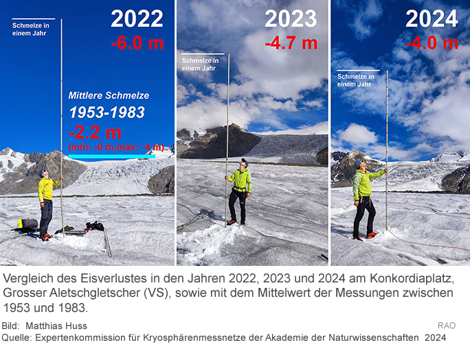 Vor allem Gletscher unterhalb von 3'000 m ü.M. haben 2025 stark gelitten. Der Schnee aus dem Winter verschwand dort bis in den Gipfelbereich. Als Folge davon nahm die Eisdicke zum Beispiel von Claridenfirn GL, Glacier de la Plaine Morte BE oder Silvrettagletscher GR im Mittel um über zwei Meter ab. Für Gletscher im südlichen Wallis wie den Allalingletscher oder Findelgletscher war der Verlust mit knapp einem Meter geringer.