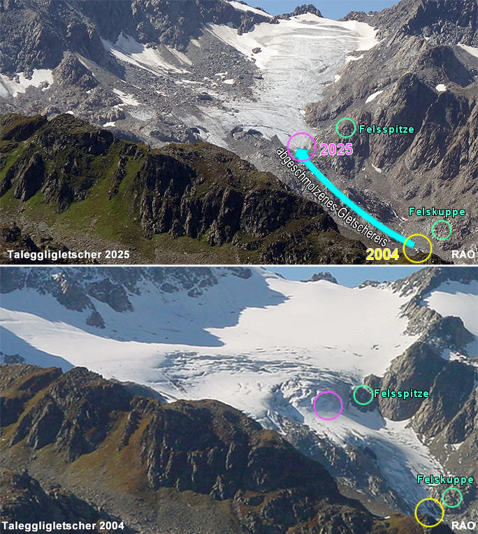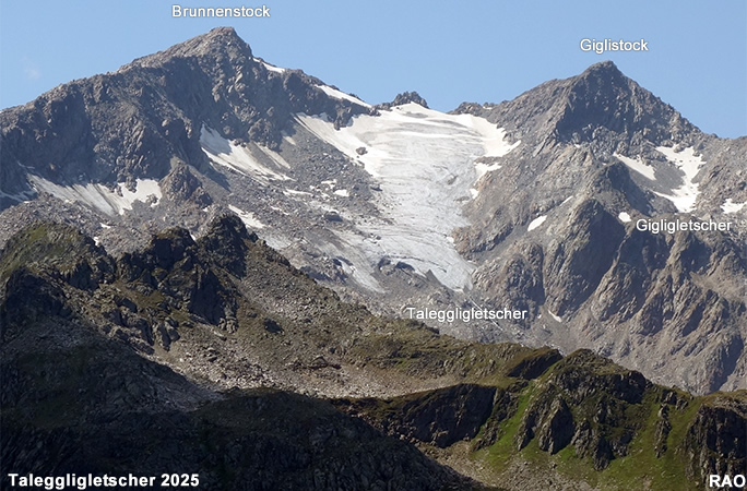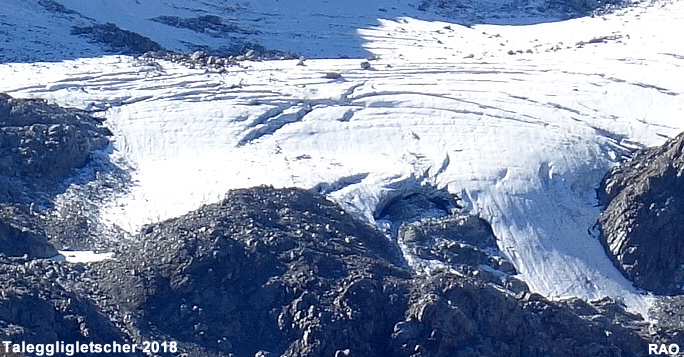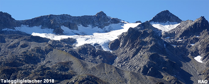 Die Häufung von Hitzesommern macht vor allem kleinen Gletschern stark zu schaffen; viele zerfallen wie der Taleggligletscher oder der Pizolgletscher richtiggehend.