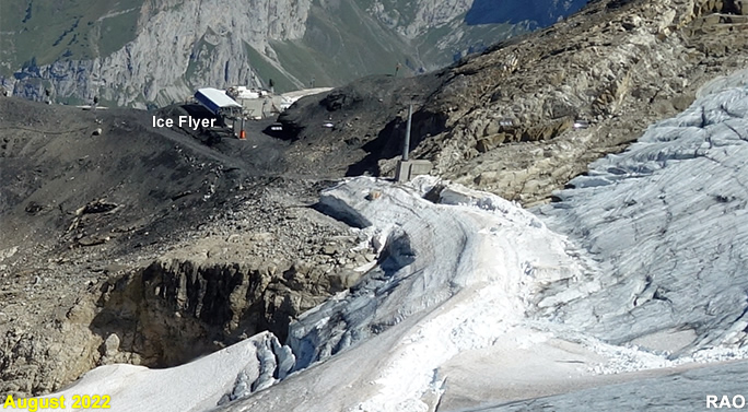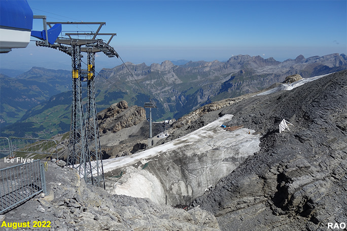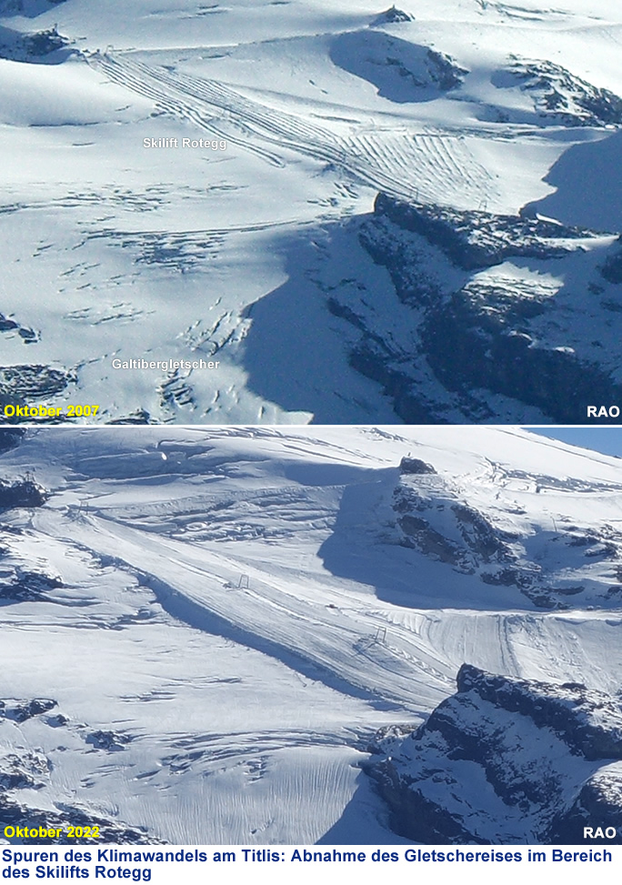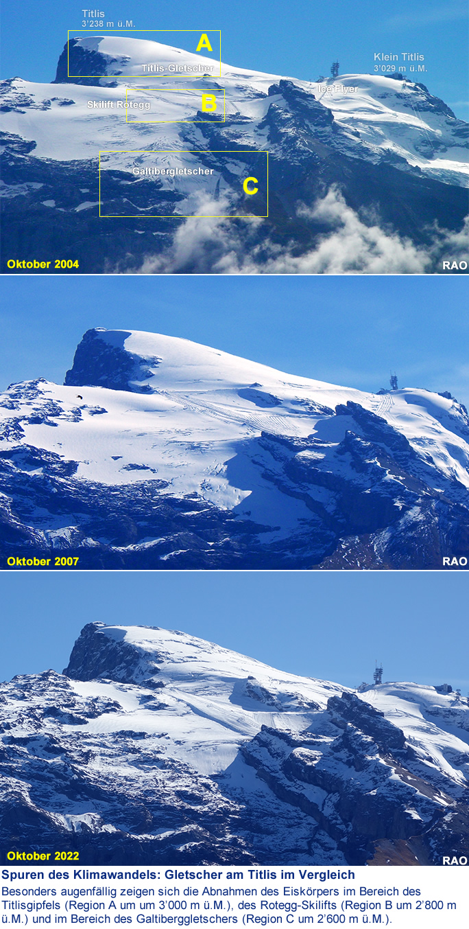 Vergleiche von Gletscherbildern aus den Jahren 2004, 2007 und 2022 zeigen trotz der aufliegenden Schicht der Oktober-Schneefälle an den beiden Gletschern am Titlis deutlich sichtbar Veränderungen.