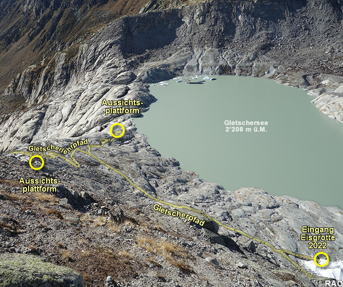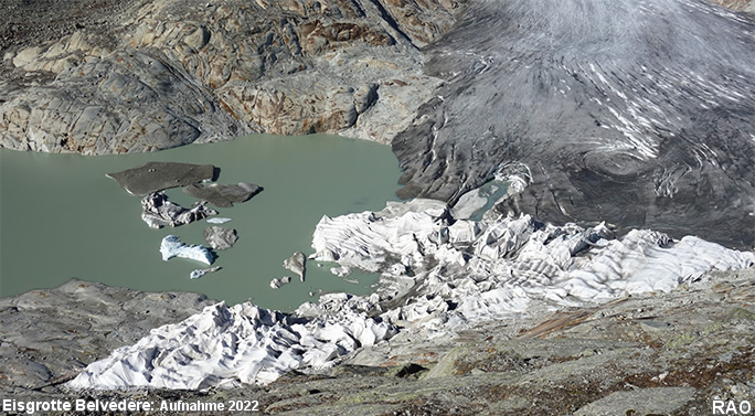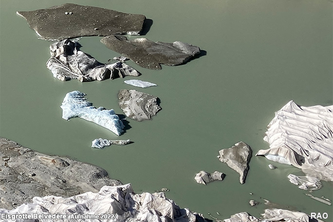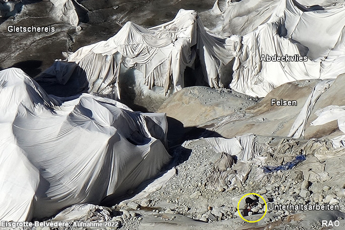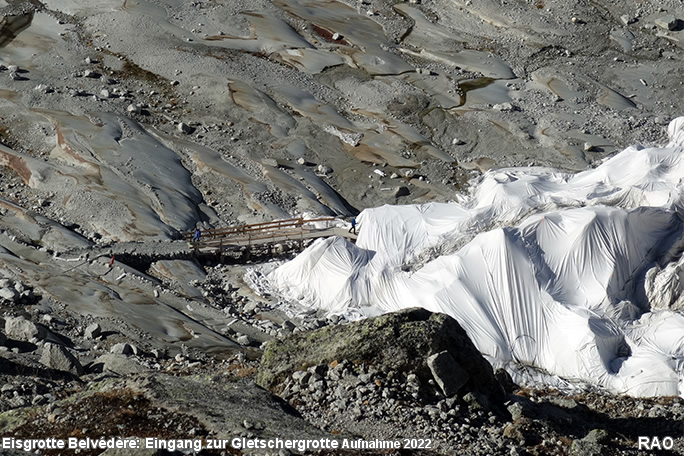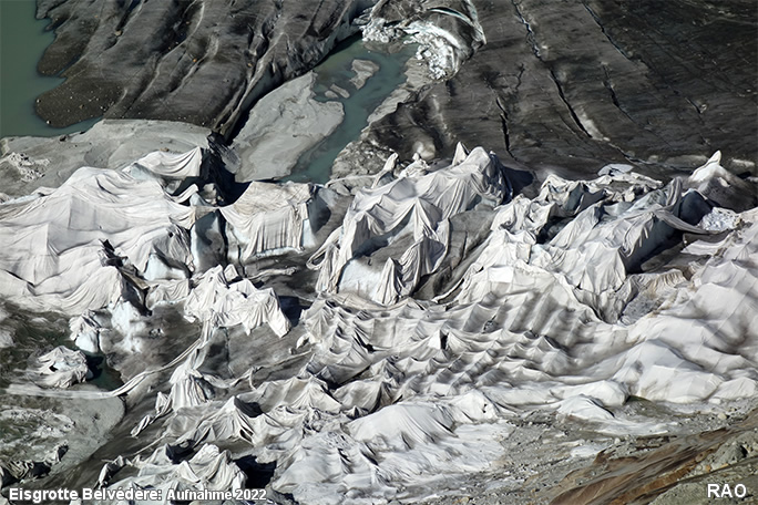 Der Gletscherpfad, welche zum Eingang der Eisgrotte führt wird jedes Jahr länger. Die Eisfläche, welche für die Eisgrotte mit Vlies abgedeckt werden muss, wird immer grösser. Die Vorgänge an der Gletscherzunge und im Eisinnern sind sehr dynamisch. Immer wieder brechen grössere Eisstücke an der Gletscherfront ab und schwimmen als Eisberge im Gletschersee. Die Naturkräfte zerreissen auch das Abdeckvlies. Es ist äusserst wahrscheinlich, dass sich die Gletscherzunge ohne Abdeckmassnahmen heute viel weiter bergwärts befinden würde.