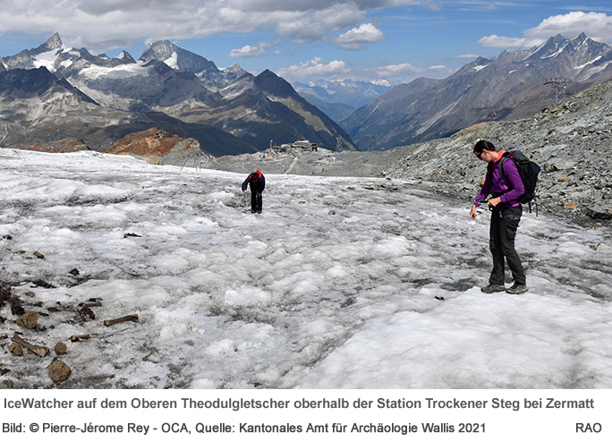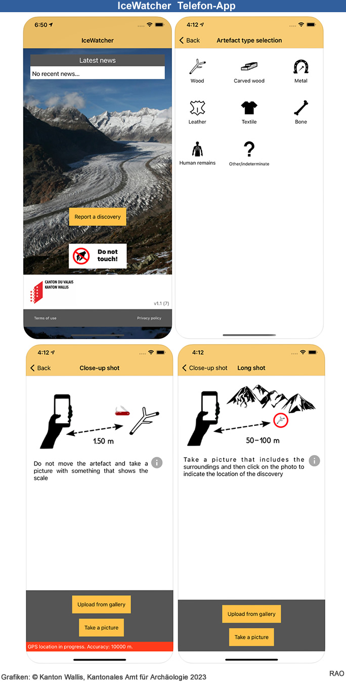 Die im Sommer 2021 lancierte Telefon-App IceWatcher (für iOS und Android) ermöglicht es Berggängern, Gletscherfunde zu dokumentieren und zugleich das kantonale Amt für Archäologie darüber zu informieren. Dank Geolokalisierung und eines Meldeprozesses kann das kantonale Amt für Archäologie die Stichhaltigkeit der gemeldeten Funde prüfen und Massnahmen zu deren Bergung und Konservierung unternehmen.
