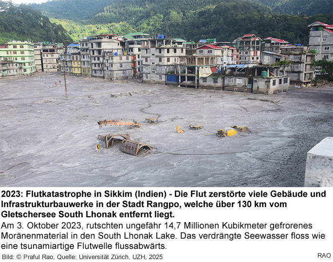 Mit dem Klimawandel dringt die Erwärmung verzögert auch in den Untergrund vor. Damit steigen auch in Permafrostgebieten die Temperaturen im Innern der Berge und Felsstürze im Hochgebirge werden wahrscheinlicher. Zusammen mit dem wachsenden Energiebedarf in den Himalaya-Staaten wird sich die Problematik weiter verschärfen. «Chamoli war ein seltenes Extremereignis», sagt Holger Frey. «Aber es ist nur eine Frage der Zeit, bis sich die nächste Flutwelle dieser Grössenordnung irgendwo im Himalaya ereignet.» Da zahlreiche weitere Kraftwerksanlagen geplant sind, sind rasche und nachhaltige Lösungen notwendig - und eine enge Zusammenarbeit mit der Wissenschaft. «Wir müssend die fortschrittlichsten Techniken und Kenntnisse zu nutzen, damit in Zukunft Menschenleben und Vermögenswerte besser geschützt werden können», sagt Christian Huggel. Denn auch in andern Gebirgsregionen sind solche seltenen Grossereignisse nicht ausgeschlossen und können verheerende Auswirkungen haben, vor allem in relativ dicht bebauten Regionen wie den Alpen.
