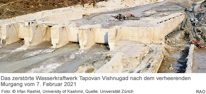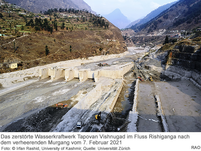 Am 7. Februar 2021 ergossen sich gewaltige Massen von Wasser, Schlamm, Felsbrocken und Eistrümmer durch das Tal des Rishiganga und Dhauliganga Flusses und hinterliessen eine Spur der Verwüstung. Über 200 Menschen verloren ihr Leben, zwei Wasserkraftwerke sowie mehrere Brücken und Strassen wurden zerstört. Die verheerende Flutwelle in Chamoli im Indischen Himalaya durch einen gewaltigen Bergsturz, der einen Gletscher mitgerissen hat, ausgelöst.