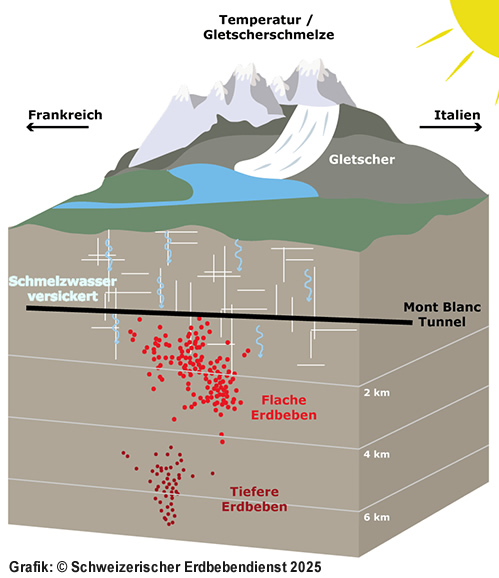 Unter dem Mont-Blanc-Massiv und der Grandes Jorasses verläuft eine bis zu 600 Meter breite, wasserdurchlässige Schwächezone im Gestein. Sie erleichtert das Versickern von Schmelzwasser. Die Studie zeigt, dass entlang dieser tektonisch geschwächten Zone junges, kaltes Schmelzwasser von den rund 2'500 Meter höher gelegenen Gletschern nach etwa 70 Tagen in den Mont-Blanc-Tunnel eindringt. Die Erdbeben konzentrieren sich entlang der Schwächezone in Tiefen bis zu acht Kilometern unter dem Tunnelniveau.