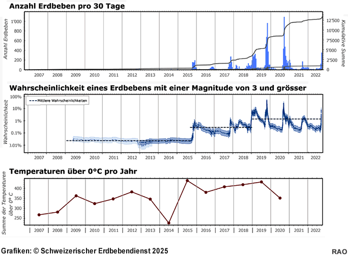 Seit 2015 stiegen die Temperaturen über dem Gefrierpunkt deutlich an. Gleichzeitig nahm die Erdbebenaktivität signifikant zu - und damit auch die lokale Erdbebengefährdung, insbesondere in den Monaten von Herbst bis Frühjahr.