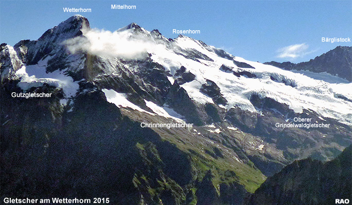 Wetterhorn mit v.l.n.r Gutzgletscher, Chrinnengletscher und Oberer Grindelwaldgletscher 2015 (Kanton Bern)