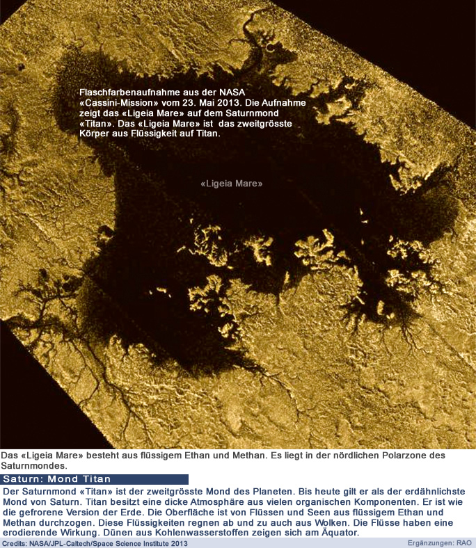 Der rötlich schimmernde Titan ist mit einem Durchmesser von 5'150 Kilometer nicht nur der grösste der bisher bekannten 34 Monde des Saturns. Titan ist - nach dem Jupitermond Ganymed - überhaupt der zweitgrösste Mond unseres Sonnensystems, und grösser als der Planet Merkur. Mond oder Planet? Titan verkörpert eine ausgesprochen komplexe eigene Welt. Viele seiner Eigenschaften lassen ihn wie einen Planeten des inneren Sonnensystems erscheinen. Er besitzt als einziger Mond des Sonnensystems eine Atmosphäre. Sie besteht im Wesentlichen aus Stickstoff und Kohlenwasserstoffen, wie Methan und Ethan sowie Spuren von Wasserdampf und Ammoniak. Titans Atmosphäre dürfte in grossen Teilen vergleichbar sein mit dem Zustand der irdischen Ur-Atmosphäre vor über vier Milliarden Jahre. Die