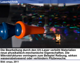 Indem Oberflächen mikrostrukturiert werden, lassen sich neue physikalisch-mechanische Effekte hervorrufen; die Mikrostrukturen verringern beispielsweise Reibung, reduzieren den Luftwiderstand oder verhindern Pilzbewuchs. Anfertigen lassen sich auch Folien für optische Strukturen mit lichtsteuernden Eigenschaften, zum Beispiel 3D-Bildschirme, die ohne Brillen funktionieren. Patrik Hoffmann, Leiter der Empa-Abteilung «Advanced Materials Processing», kann sich zudem vorstellen, damit neuartige Fensterscheiben zu entwickeln, die nachts Innenräume beleuchten und tagsüber als Solarzelle fungieren. Ihm schwebt auch vor, Materialien für elektrochemische Prozesse vorzukeimen, um damit elektrische Verbindungen auf flexiblen Bildschirmen oder Solarzellen wachsen zu lassen.