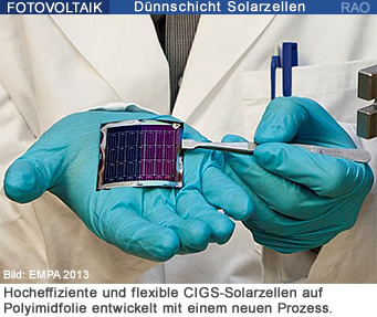 Empa-Wissenschaftler haben ein neues Herstellungsverfahren für hocheffiziente, flexible Dünnschicht-solarzellen aus CIGS-Halbleitern (Kupfer-Indium-Gallium-Diselenid) entwickelt. Damit haben sie einen Wirkungsgrad von 20.4% für die Umwandlung von Sonnenlicht in elektrische Energie erreicht. Da die Solarzellen auf flexiblen Plastikfolien aufgebracht sind, könnten sie sich industriell kostengünstig im «Rolle-zu-Rolle»-Verfahren herstellen lassen.