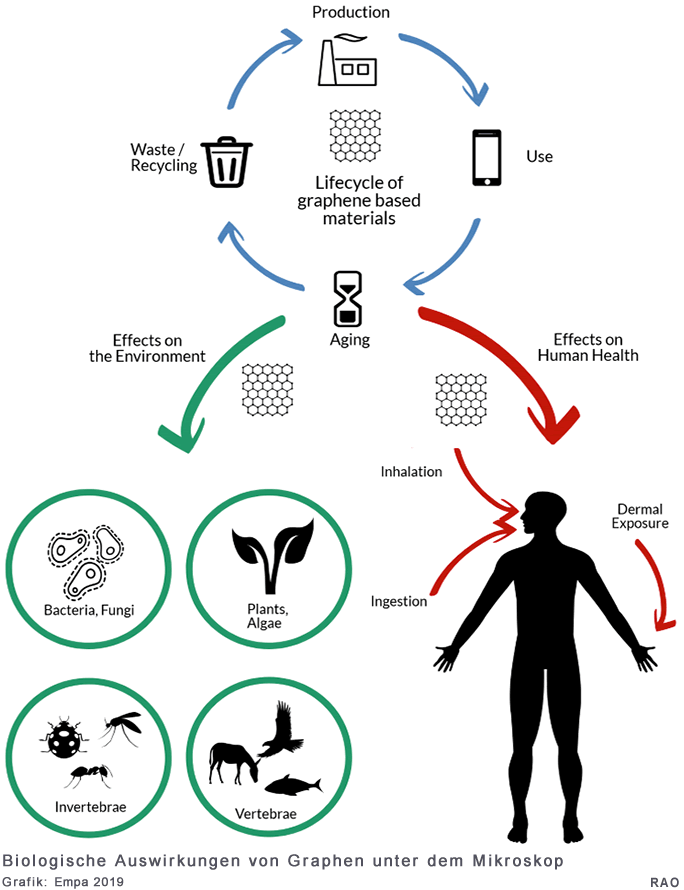 Der Artikel gibt eine Übersicht darüber, wann im Lebenszyklus von graphenbasierten Materialien überhaupt Teile davon in die Umwelt oder den menschlichen Körper gelangen können: bei der Produktion, im Gebrauch, bei der Alterung oder im Entsorgungs- oder Recyclingprozess.