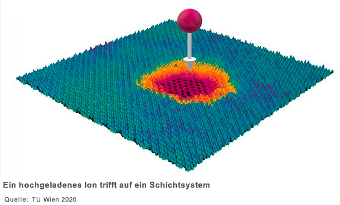 Wenn man mit einem Ionenstrahl eine Oberfläche bearbeitet, ist es normalerweise die Wucht des Aufpralls der Ionen, die das Material verändert. An der TU Wien hingegen verwendete man relativ langsame Ionen, die dafür aber gleich mehrfach elektrisch geladen sind. "Man muss hier zwei unterschiedliche Formen von Energie unterscheiden", erklärt Prof. Richard Wilhelm. "Einerseits die kinetische Energie, die von der Geschwindigkeit abhängt, mit der die Ionen auf der Oberfläche einschlagen. Andererseits aber auch die potentielle Energie, die durch die elektrische Ladung der Ionen bestimmt wird. Bei herkömmlichen Methoden war die kinetische Energie entscheidend, uns hingegen ist die potentielle Energie besonders wichtig."
