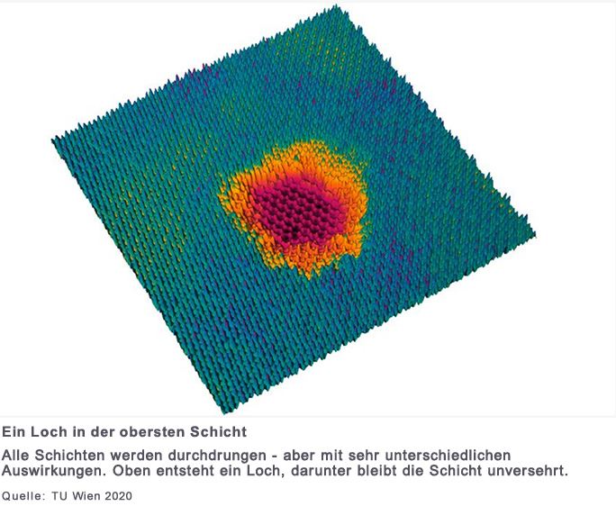 Niemand kann eine Pistolenkugel so durch eine Banane schiessen, dass die Schale durchlöchert wird, die Banane aber heil bleibt. Auf der Ebene einzelner atomarer Schichten ist ein solches Kunststück nun allerdings gelungen - an der TU Wien wurde eine Nano-Strukturierungs-Methode entwickelt, mit der man bestimmte Materialschichten extrem präzise perforieren und andere völlig unangetastet lassen kann, obwohl das Projektil alle Schichten durchdringt.
