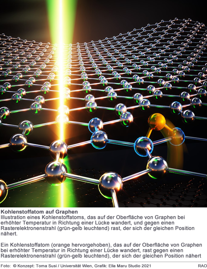 Indem die Forscher die atomare Struktur von Graphen mit Elektronen sichtbar machten und dabei gelegentlich Atome herausschleuderten, konnten sie bestimmen, wie schnell sich die Kohlenstoffatome auf der Oberfläche bewegen müssen, um das Füllen der entstehenden Löcher bei erhöhten Temperaturen zu erklären. Somit konnte durch die Kombination von Elektronenmikroskopie, Computersimulationen und dem Verständnis für das Zusammenspiel von Bildentstehung und Diffusion eine Schätzung für die Energiebarriere ermittelt werden. "Nach sorgfältiger Analyse konnten wir einen Wert von 0,33 Elektronenvolt dingfest machen, etwas niedriger als erwartet", so der Erstautor Andreas Postl.