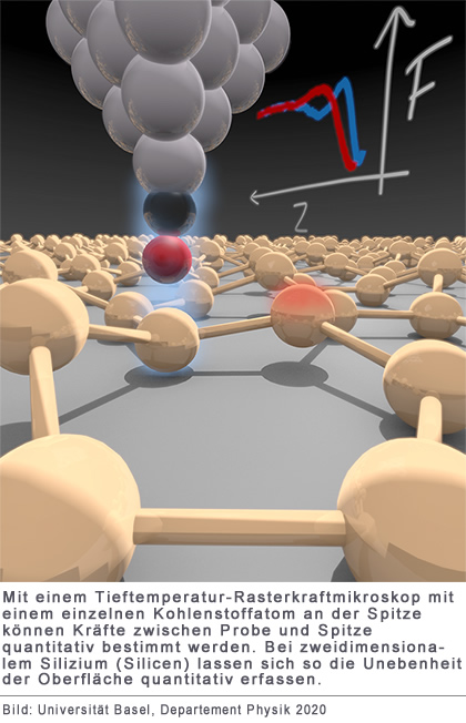 | Dem Forscherteam um Professor Ernst Meyer vom Departement Physik und Swiss Nanoscience Institute der Universität Basel ist es nun gelungen, diese winzigen Höhenunterschiede quantitativ darzustellen und die unterschiedliche Anordnung der Atome zu erfassen, die sich in einem Bereich von unter einem Ångström (1 Å = 10-10 m) bewegt - das entspricht dem zehnmillionsten Teil eines Millimeters.