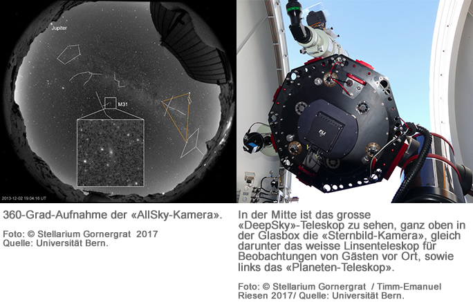 Zum Angebot gehört schliesslich eine hochempfindliche Schwarz-Weiss Kamera mit einem Fischauge-Objektiv, welches den ganzen Himmel abbilden kann. Diese «AllSky-Kamera» liefert alle fünf Minuten bei jedem Wetter und zu jeder Tages- und Nachtzeit eine 360-Grad-Aufnahme des Himmels auf dem Gornergrat. Diese Bilder stehen auf dem Portal, sowie auf der allgemein zugänglichen Webseite zur Verfügung. Damit lassen sich tägliche Bewegungen wie die Erdrotation, aber auch den Orbit der Erde um die Sonne veranschaulichen, genauso wie die Eigenbewegungen der Planeten relativ zu den Sternen.