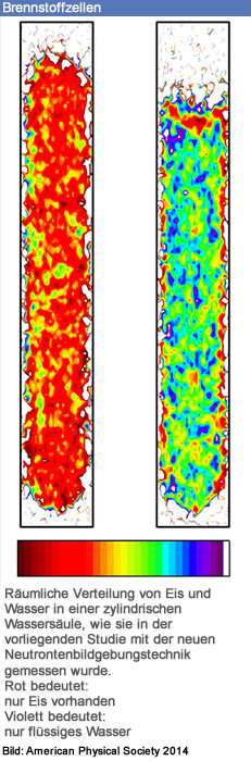 Die neue Bildgebungstechnik verwendet zwei Strahlen mit unterschiedlicher Neutronenenergie, um Bereiche mit flüssigem Wasser von solchen mit Eis mit hoher Zuverlässigkeit zu unterscheiden. Die Methode eröffnet somit die Perspektive, eines der wichtigsten Probleme bei der Anwendung von Brennstoffzellen als Antrieb von Fahrzeugen zu untersuchen. Eis kann nämlich die Poren in den Brennstoffzellen verstopfen und dadurch ihre Funktion beeinträchtigen. Ihre Ergebnisse veröffentlichen die PSI-Wissenschaftler am 16.6.2014 im Journal Physical Review Letters.