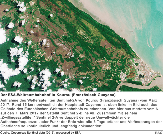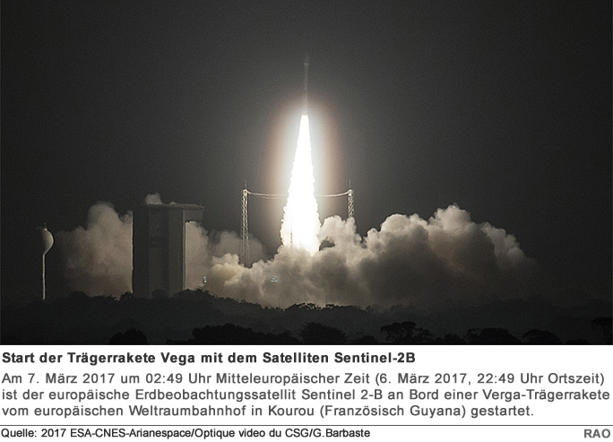 Knapp zwei Jahre nach seinem "Zwillingssatelliten" ist am 7. März 2017 um 2.49 Uhr Mitteleuropäischer Zeit (6. März, 22.49 Uhr Ortszeit) der europäische Erdbeobachtungssatellit Sentinel-2B an Bord einer Vega-Trägerrakete vom europäischen Weltraumbahnhof der ESA in Kourou (Französisch-Guyana/Südamerika) zu seiner Mission gestartet. Der zirka 1,1 Tonnen schwere Satellit soll aus 786 Kilometern Höhe von einem sonnensynchronen Orbit unsere Erde beobachten und vor allem Veränderungen der Landoberfläche und der Vegetation zwischen 84 Grad nördlicher und 56 Grad südlicher Breite dokumentieren: Reicht die Ernte für die Bevölkerung aus? Wie intensiv sollten Bauern düngen? Wie gesund sind unsere Wälder? Sentinel-2B beobachtet alle Landflächen der Erde ausser der Antarktis, einschliesslich aller Inseln, die zur EU gehören und allen weiteren Inseln, die grösser als 100 Quadratkilometer sind; aber auch Küstenzonen, sämtliche Binnengewässer, das Mittelmeer und weitere abgeschlossene Meere.