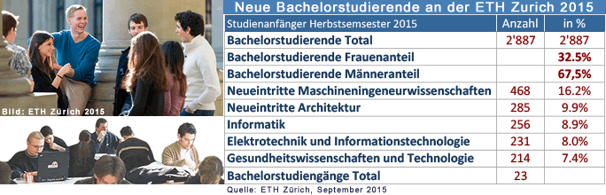 Leicht gesunken ist der Anteil der ausländischen Bachelorstudierenden. So haben in diesem Herbstsemester 17.7% der Studierenden keinen Schweizer Pass (Vorjahr 19.5%). Der Anteil der Bildungsausländerinnen und -ausländer, also jener Studierenden, die ihren Zulassungsausweis im Ausland erworben haben und jetzt für das Studium in die Schweiz kommen, liegt bei 10.9%, dem niedrigsten Wert der letzten Jahre. Ingenieurwissenschaften weiter im Vormarsch Der mit Abstand beliebteste Bachelorstudiengang ist nach wie vor Maschineningenieurwissenschaften mit 468 Neueintritten. Die Zahlen bleiben für diesen Studiengang ähnlich wie im Vorjahr (447). Architektur ist mit 285 neuen Studierenden erneut der am zweitmeisten gewählte Bachelorstudiengang. Den Trend des letzten Jahres fortsetzend sind Informatik mit 256 sowie Elektrotechnik und Informationstechnologie mit 231 Eintritten auf die Plätze 3 und 4 der Beliebtheitsskala vorgerückt. Dicht dahinter folgt der 2011 eingeführte Studiengang Gesundheitswissenschaften und Technologie mit 214 neuen Bachelorstudierenden. Auch auf Masterstufe ist die ETH Zürich sowohlbei ihren eigenen wie auch bei den Bachelorabsolventen anderer Hochschulen sehr beliebt. Erfahrungsgemäss haben etwa zwei Drittel der Masterstudierenden bereits ihren Bachelor an der ETH Zürich erworben. Dieses Jahr sind bereits im Frühjahr 401 Studierende in ein Masterprogramm übergetreten, ca. 1'200 weitere werden den Übertritt auf das Herbstsemester vollziehen. Dazu kommen etwa 750 Studierende mit extern erworbenem Bachelor, die aus 2'900 Bewerbungen hervorgegangen sind. Die meisten Neueintritte von externen Bachelorabsolventen verzeichnen die Masterprogramme Informatik und Architektur. Die genauen Eintrittszahlen ins Masterstudium sind derzeit nicht bekannt, weil sich Studierende noch bis in die zweite Semesterwoche einschreiben können. Entscheidungsprozesse begleiten Erstmals angeboten wird der Masterstudiengang «Science, Technology and Policy», der Naturwissenschaftler, Ingenieurinnen und Architekten dazu befähigen soll, Entscheidungsprozesse in Politik, Wirtschaft und Gesellschaft wissenschaftlich zu begleiten und mitzugestalten. Damit entspricht der neue Lehrgang der Idee der Critical Thinking Initiative, deren Ziel es ist, die Studierenden der ETH Zürich zu kritischen und unabhängig denkenden Persönlichkeiten auszubilden. Gesamtzahl der Studierenden wächst weiter Zählt man die eintretenden Bachelorstudierenden, die externen Masterstudierenden sowie die Gast- und Mobilitätsstudierenden zusammen, werden am kommenden Montag schätzungsweise 3'900 neue Studierende ihre erste Vorlesung an der ETH Zürich besuchen. Die Gesamtzahl der Studierenden wird erneut leicht steigen. Zusammen mit den 4'100 Doktorierenden werden im kommenden Semester gegen 19'000 Frauen und Männer an der ETH Zürich studieren. Dieter Wüest, Leiter des Rektorats der ETH Zürich, erklärt, dass die ETH in den nächsten Jahren eine Abschwächung dieses Wachstums erwartet, so dass sich die Gesamtzahl Studierender bis Ende des Jahrzehnts bei 20'000 oder etwas darüber konsolidieren wird. ETH Zürich auch für einen Mobilitätsaufenthalt sehr begehrt In diesem Herbstsemester erwartet die ETH Zürich zusätzlich ca. 340 Mobilitäts- oder Gaststudierende, die für ein oder zwei Semester die ETH besuchen werden. Etwas weniger als die Hälfte von ihnen kommt von europäischen Hochschulen, die übrigen aus Amerika, Asien und Australien. Die Mehrzahl dieser Studierenden kommt im Rahmen von Austauschprogrammen nach Zürich, was bedeutet, dass die ETH ihrerseits Studierende für einen Aufenthalt an die betreffenden Partnerhochschulen entsenden kann. Im Studienjahr 2015/16 werden gegen 300 ETH-Studierende von dieser Möglichkeit profitieren können.