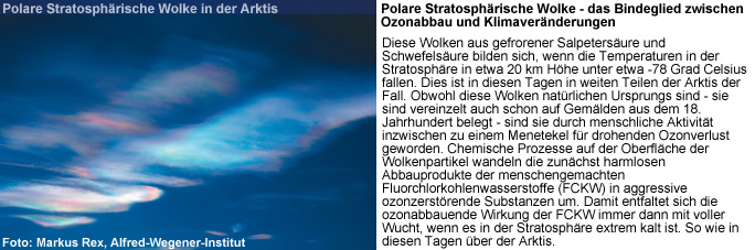 "Der aktuelle Winter setzt die Entwicklung eindrucksvoll fort, dernicht im Widerspruch zur globalen Klimaerwärmung steht.", erläutert Atmosphärenforscher Rex einen nur auf den ersten Blick paradox erscheinenden Zusammenhang. "Vereinfacht gesagt halten steigende Treibhausgaskonzentrationen die Wärmestrahlung der Erde in tieferen Luftschichten zurück und erwärmen diese. In die darüber gelegene Stratosphäre gelangt weniger der wärmenden Strahlung, dort kommt es dann zu einer Abkühlung. Daher beobachtet man parallel zur Erwärmung des Klimas am Boden eine Abkühlung der Stratosphäre". Diese findet ausgerechnet im Bereich der Ozonschicht statt und bewirkt offensichtlich die nun beobachtete Verstärkung des Ozonabbaus.
