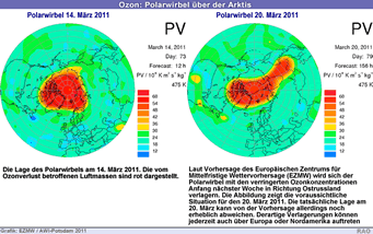 Die ozonarmen Luftschichten haben sich vergangene Woche etwa vom Nordpol bis nachSüdskandinavien erstreckt und haben dort an sonnigen Tagen zu erhöhter ultravioletter Strahlung geführt. Gegenwärtig driften sie ostwärts, werden in den kommenden Tagen über Teilen Russlands liegen und in ihrer südlichen Ausdehnung eventuell bis zur chinesisch-russischen Grenze vordringen. Die in der Arktis vom Ozonverlust betroffenen Luftschichten können in den nächsten Wochen auch über Mitteleuropa driften und dabei bis zum Mittelmeerraum vorstossen. Vor diesem Hintergrund bestätigte Dr. Markus Rex, Atmosphärenphysiker des Alfred-Wegener-Instituts für Polar- und Meeresforschung in der Helmholtz-Gemeinschaft (AWI) heute auf einer internationalen Pressekonferenz der "World Meteorological Organisation (WMO)" in Wien den beispiellosen Schwund der arktischen Ozonschicht, der sich seit Mitte März weiter verstärkt hat.