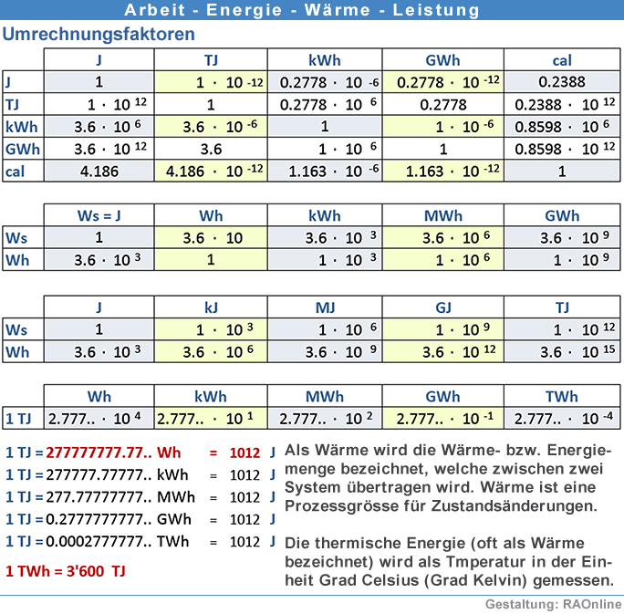 Physik, Mechanik, Wärmelehre, Energie, Joule, Watt, Kalorie, Pferdestärke, Kilowattstunde, Gigawattstunde, Terajoule, Wattsekunde, Umrechnungstabelle, Umrechnung, Umrechnungsfaktor, Masseinheit