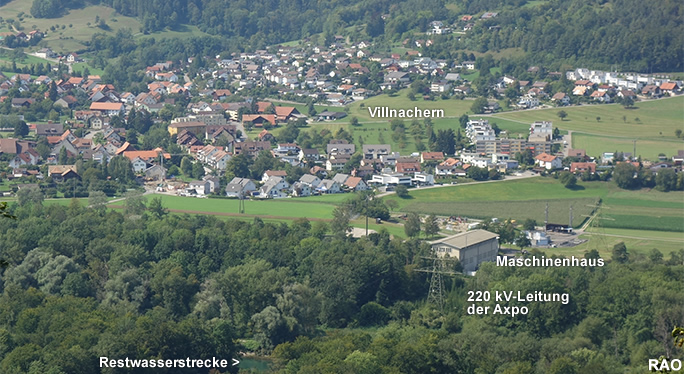 Das Maschinenhaus (Zentrale) mit den zwei Kaplanturbinen liegt auf dem Gemeindegebiet von Villnachern. Die Zentrale teilt den rund 4,5 km langen Seitenarm der Aare in den Oberwasser- und Unterwasserkanal.
