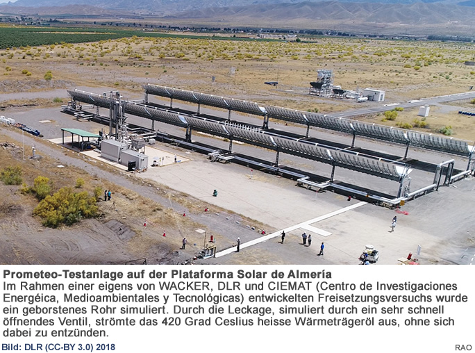 Im Rahmen eines eigens von WACKER, DLR und CIEMAT (Centro de Investigaciones Energéticas, Medioambientales y Tecnológicas) entwickelten Freisetzungsversuchs wurde ein geborstenes Rohr simuliert. Durch die Leckage, simuliert durch ein sehr schnell öffnendes Ventil, strömte das 420 Grad Celsius heisse Wärmeträgeröl aus, ohne sich dabei zu entzünden.