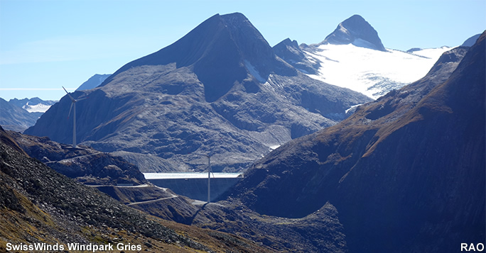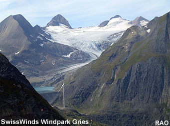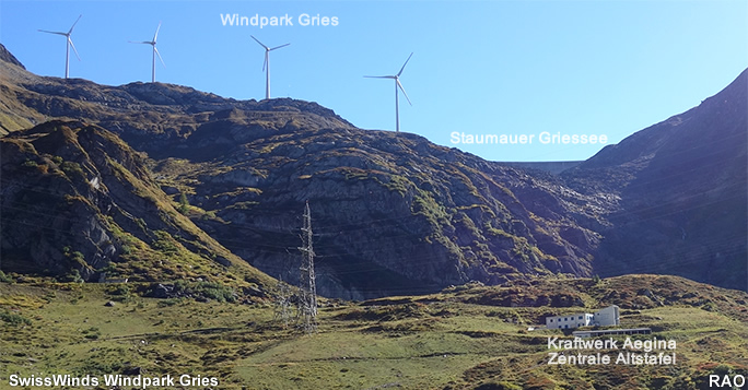 Auf dem Griespass in der Nähe des Nufenenpasses steht seit Anfang 2012 ein Windkraftwerk. Jede dieser Anlagen produziert rund 3 GWh Energie und produziert damit Strom für je 800 Haushalte. Die Anlagen schalten ab 2,5 m/s Wind ein und weisen bei 15 m/s die grösste Produktionsleistung auf.